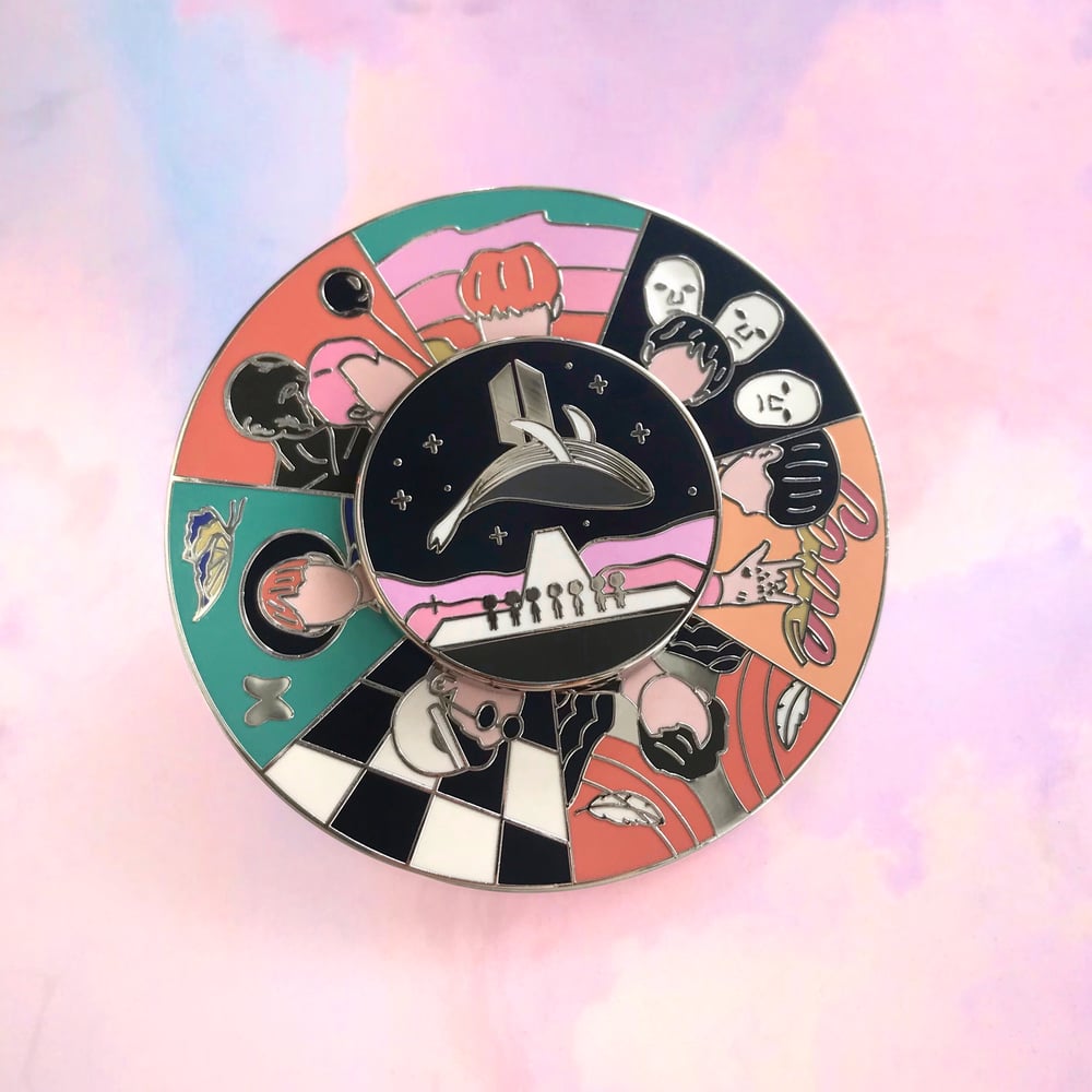 Hard enamel, 5cm, silver plating, 2.5cm centre piece spins!